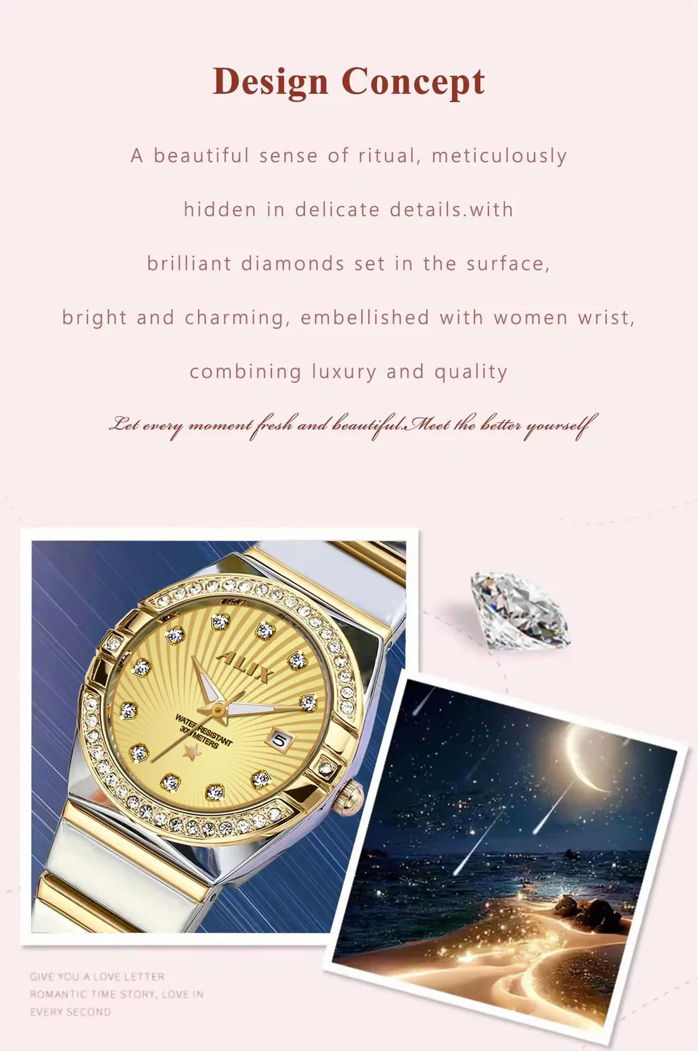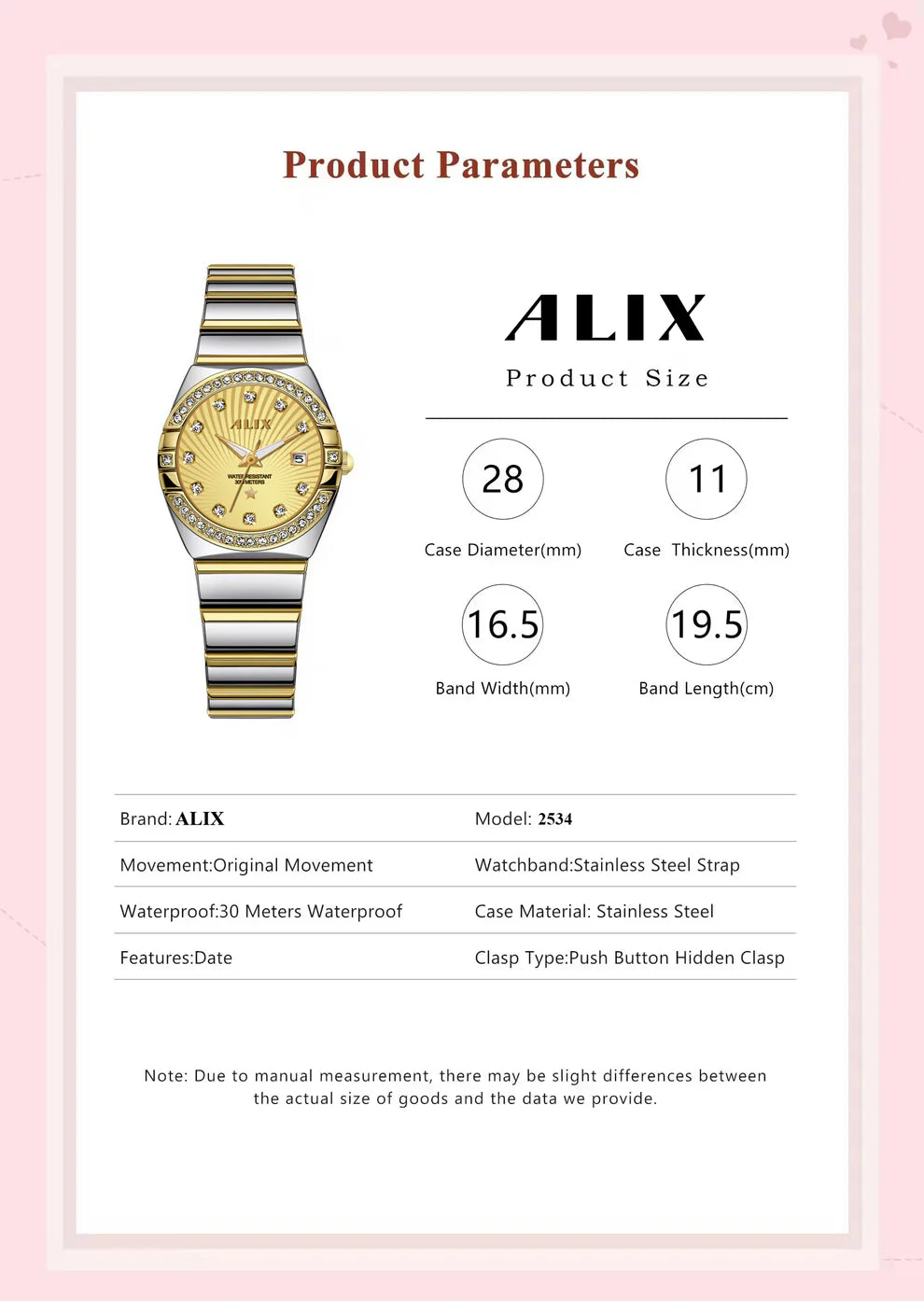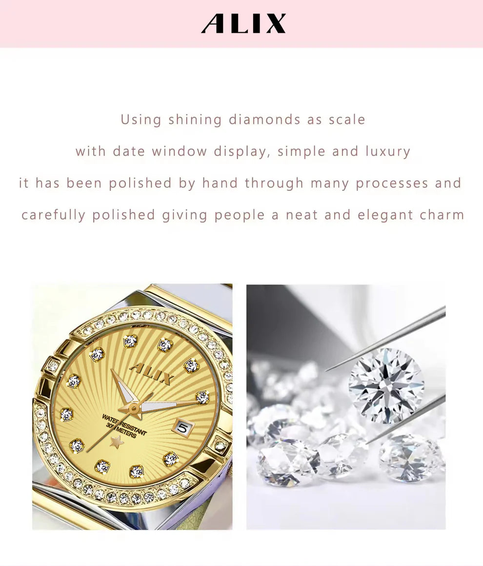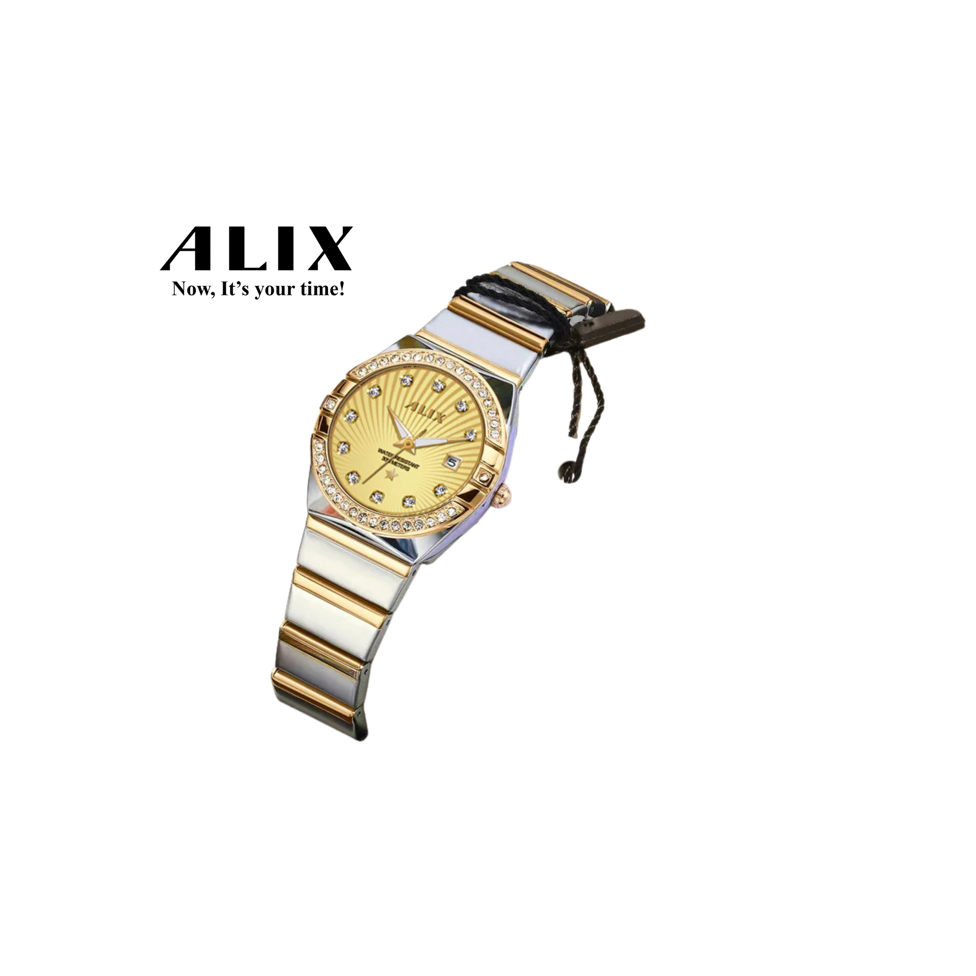 The ALIX AL2534 is a refined ladies' analog watch featuring a gold dial with diamond accents, a stylish silver & gold two-tone stainless steel bracelet, and a date display. An ideal blend of elegance and everyday functionality.
