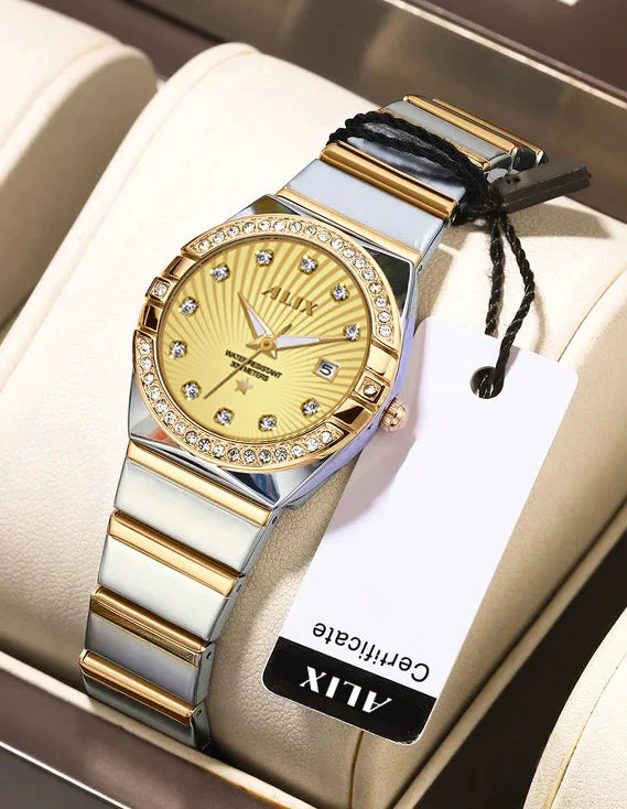 ALIX AL2534 – Women's Gold Dial Analog Watch | Two-Tone Silver & Gold Strap | Date Display | Diamond Accents