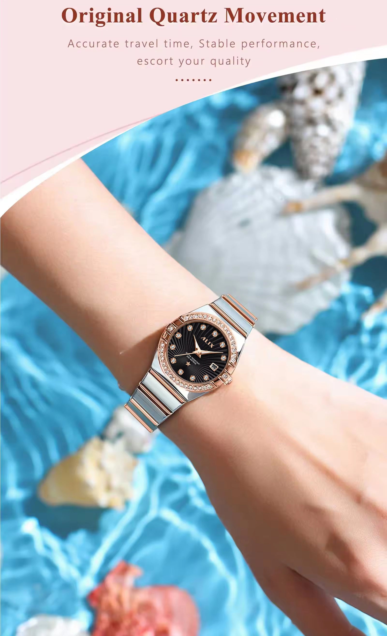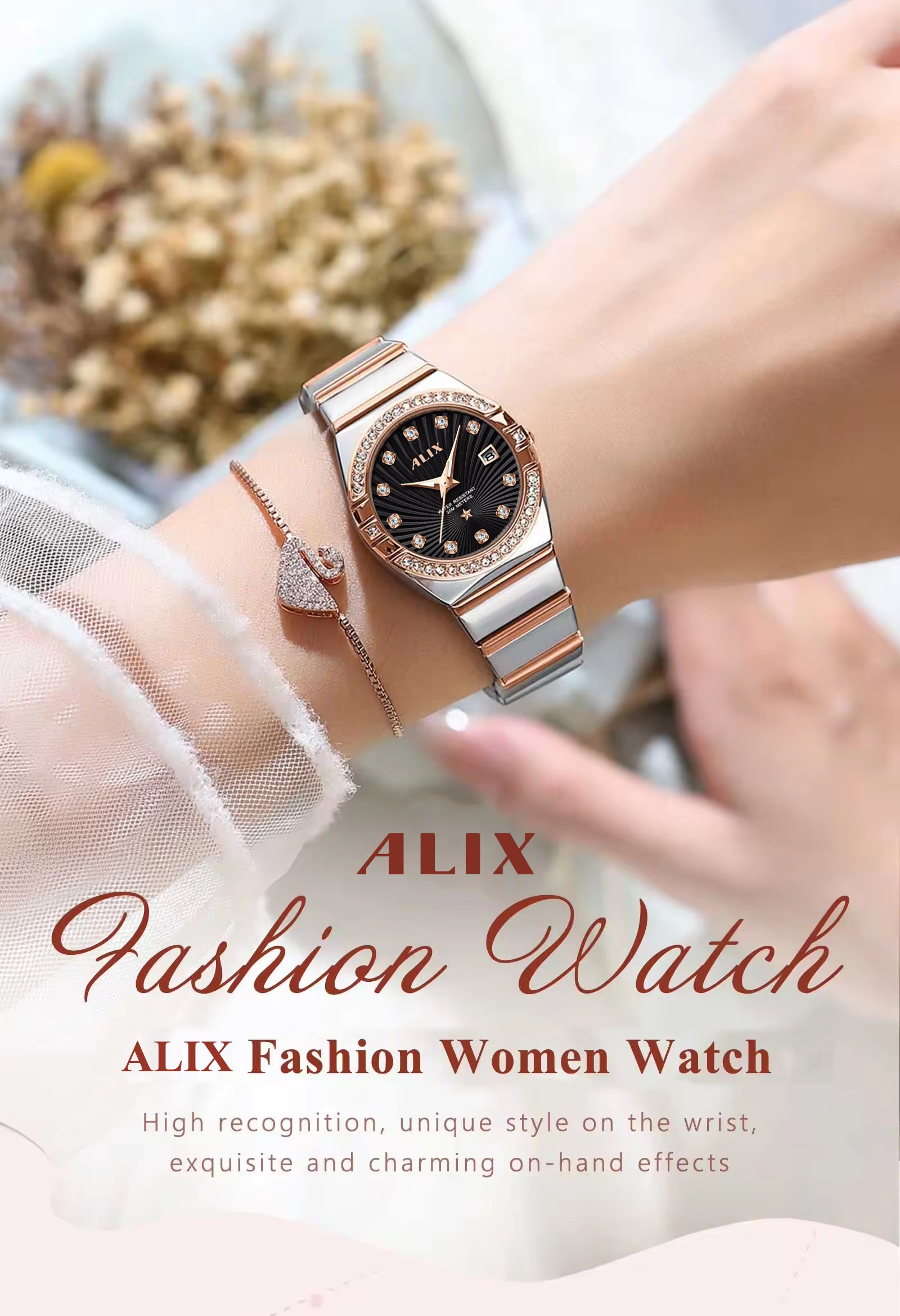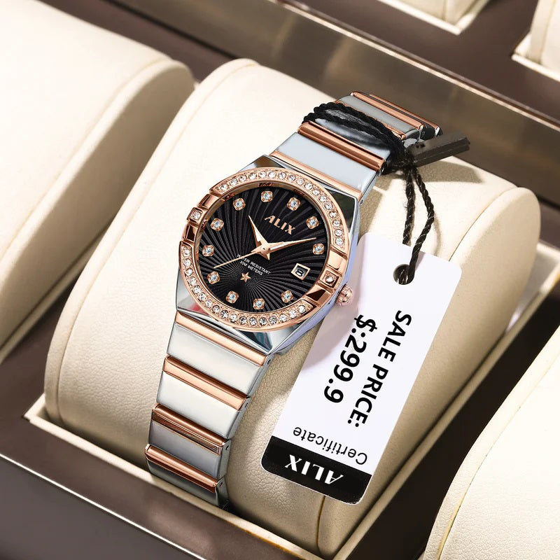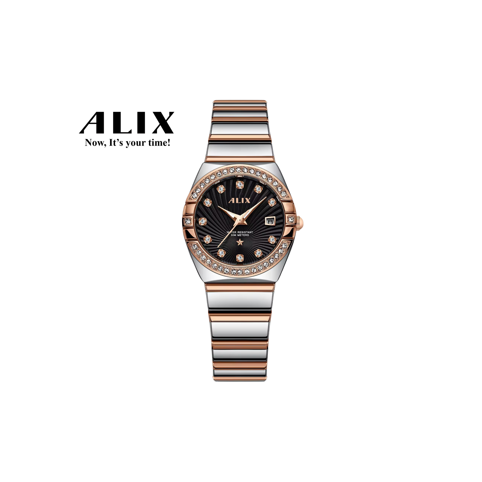 The ALIX AL2534 is a refined ladies' analog watch featuring a Black dial with diamond accents, a stylish silver & gold two-tone stainless steel bracelet, and a date display. An ideal blend of elegance and everyday functionality.