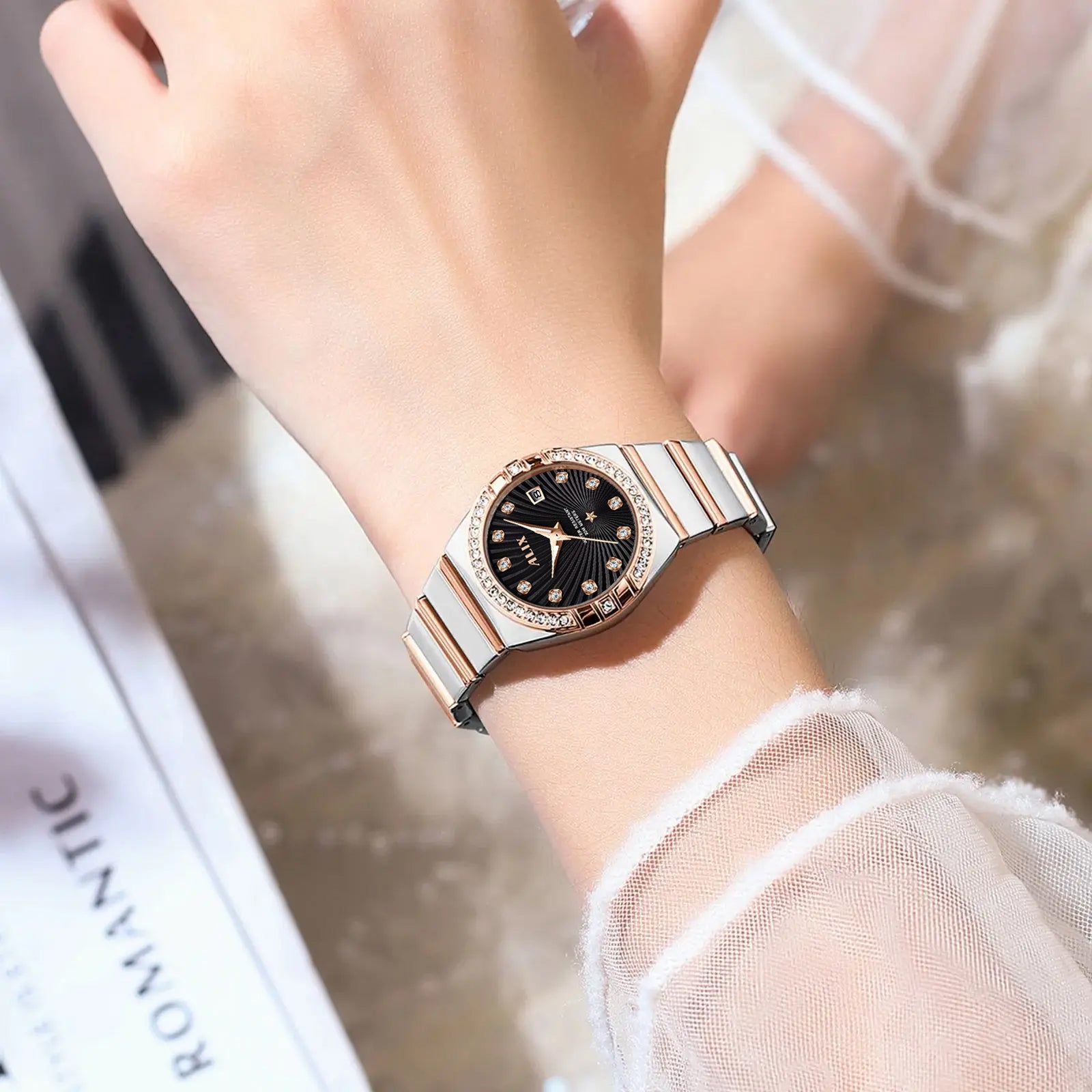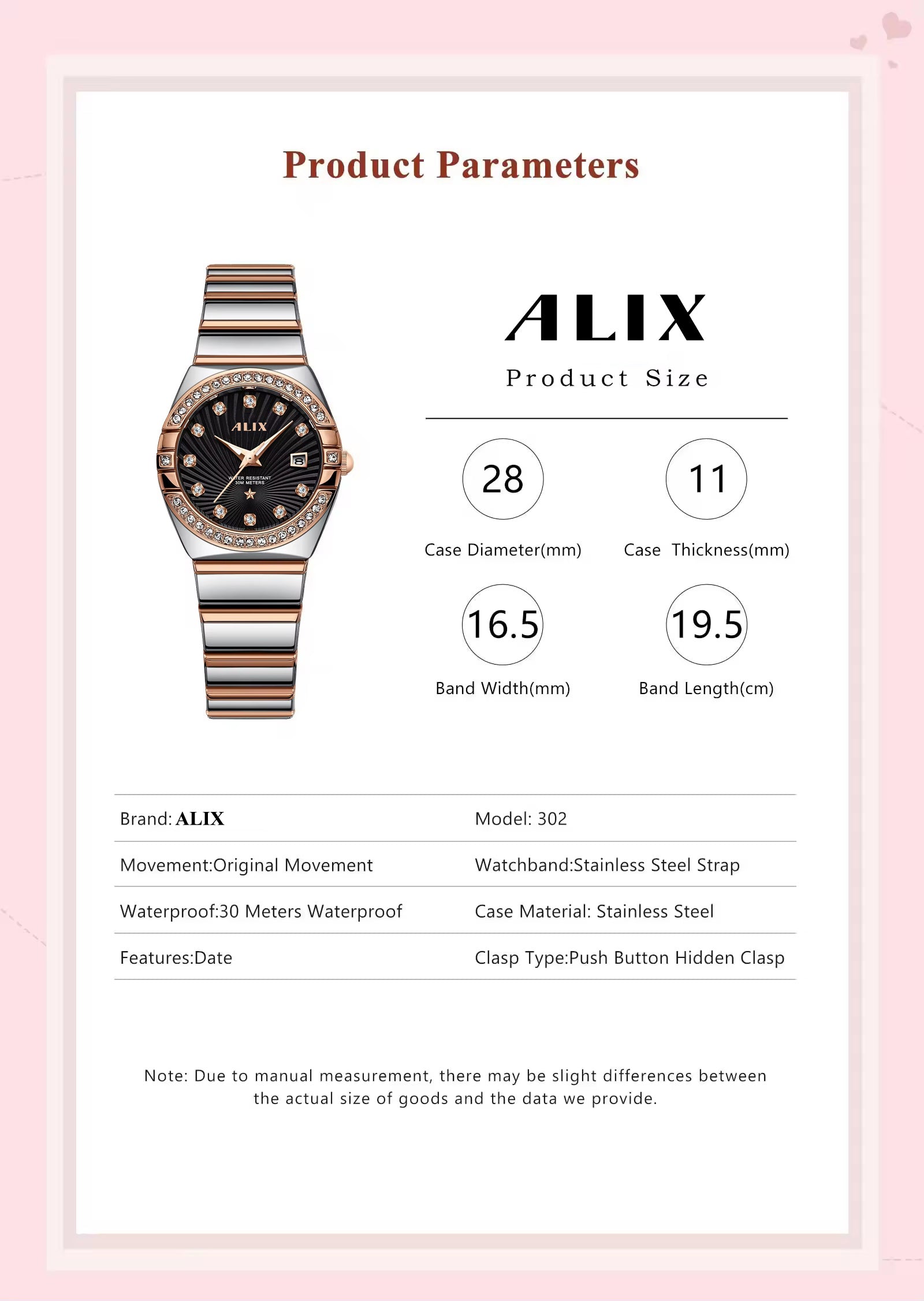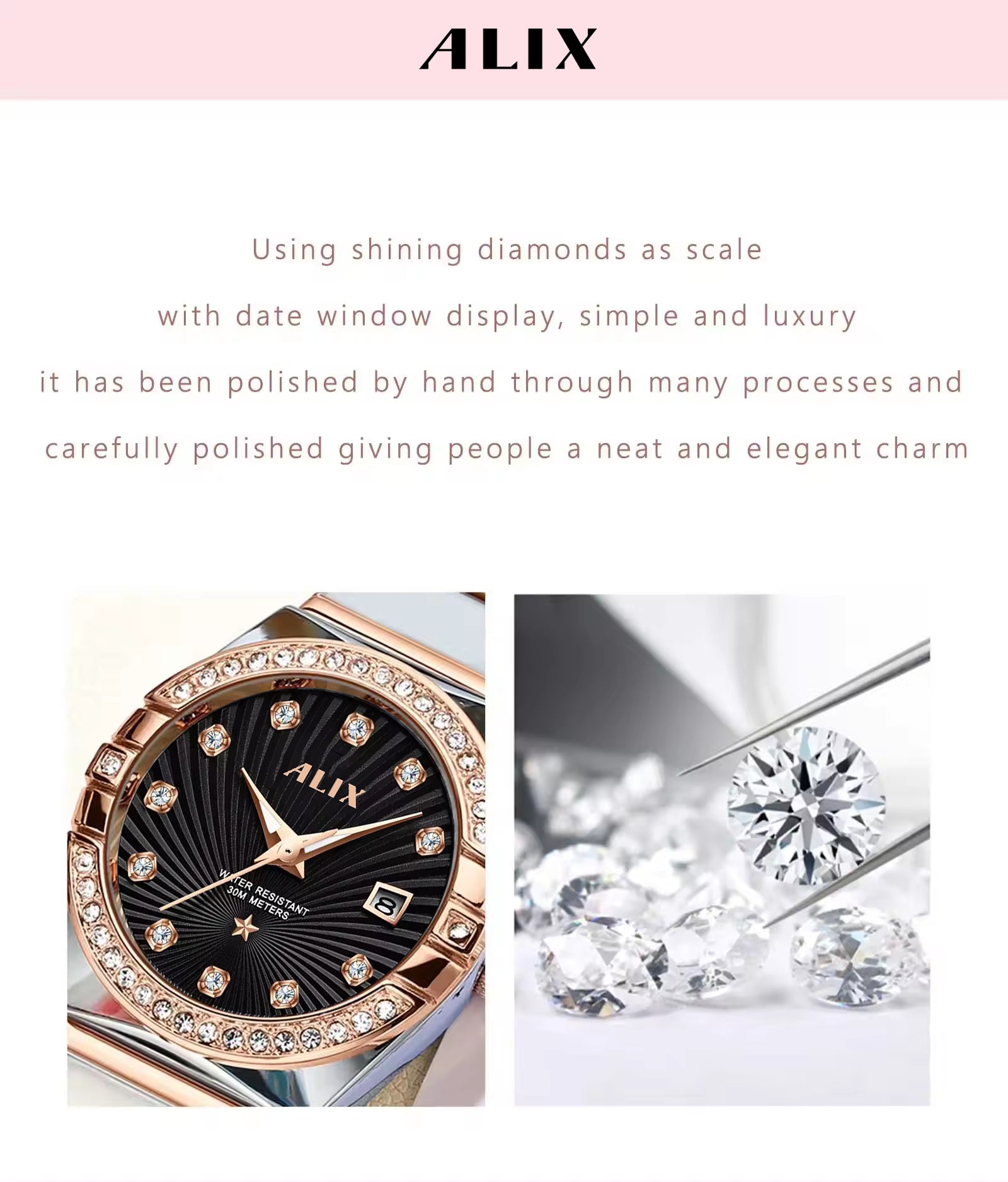 The ALIX AL2534 is a refined ladies' analog watch featuring a Black dial with diamond accents, a stylish silver & gold two-tone stainless steel bracelet, and a date display. An ideal blend of elegance and everyday functionality.