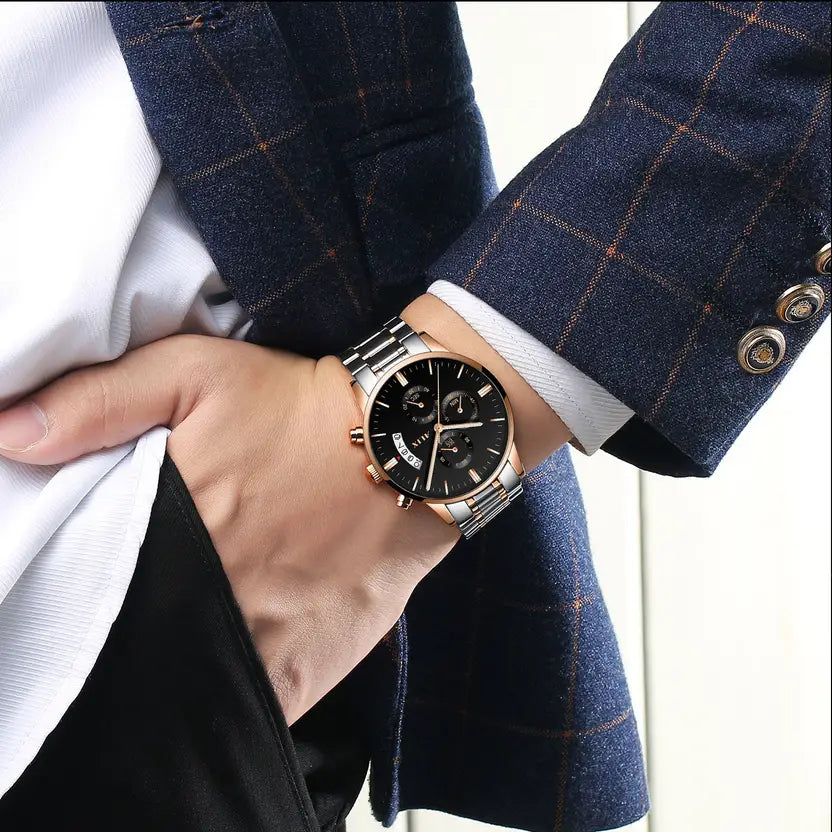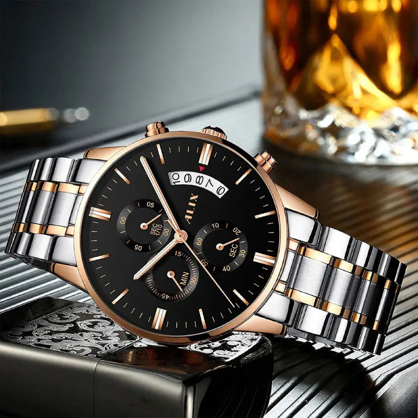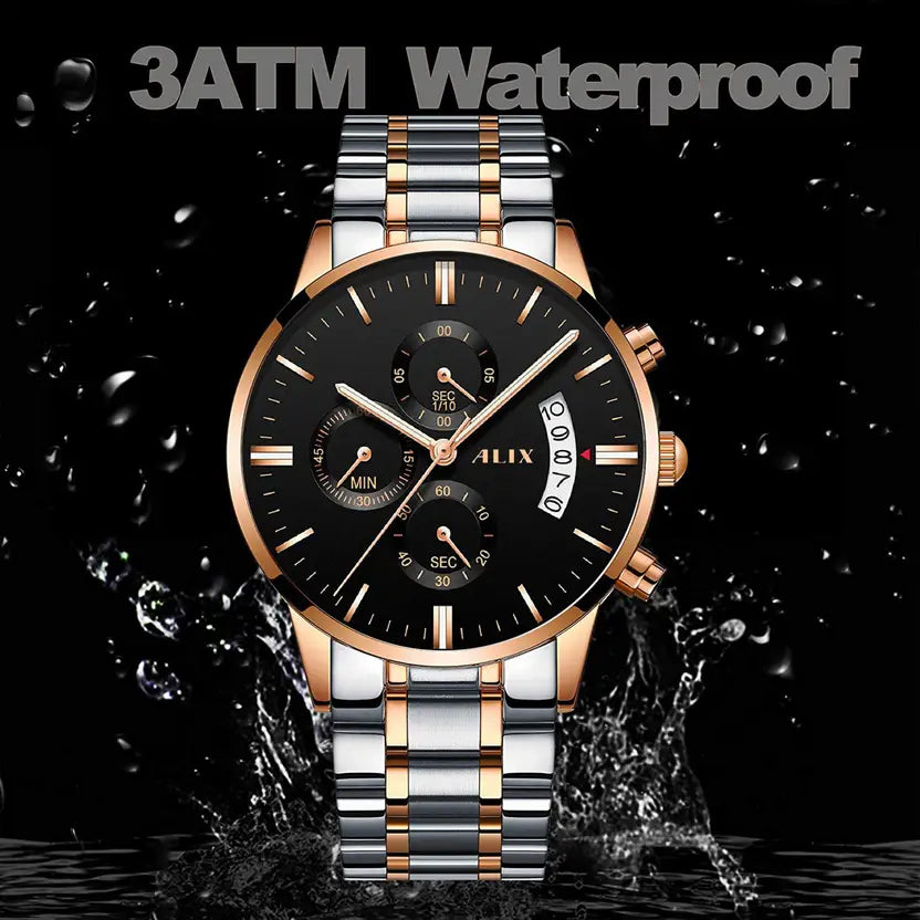 Alix 2309 Luxury Chronograph Analog Watch for Men – Black & Rose Gold Dial with Silver-Rose Gold Strap