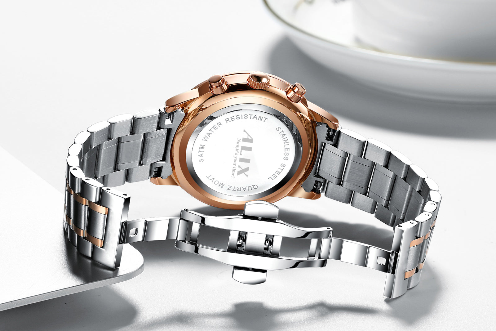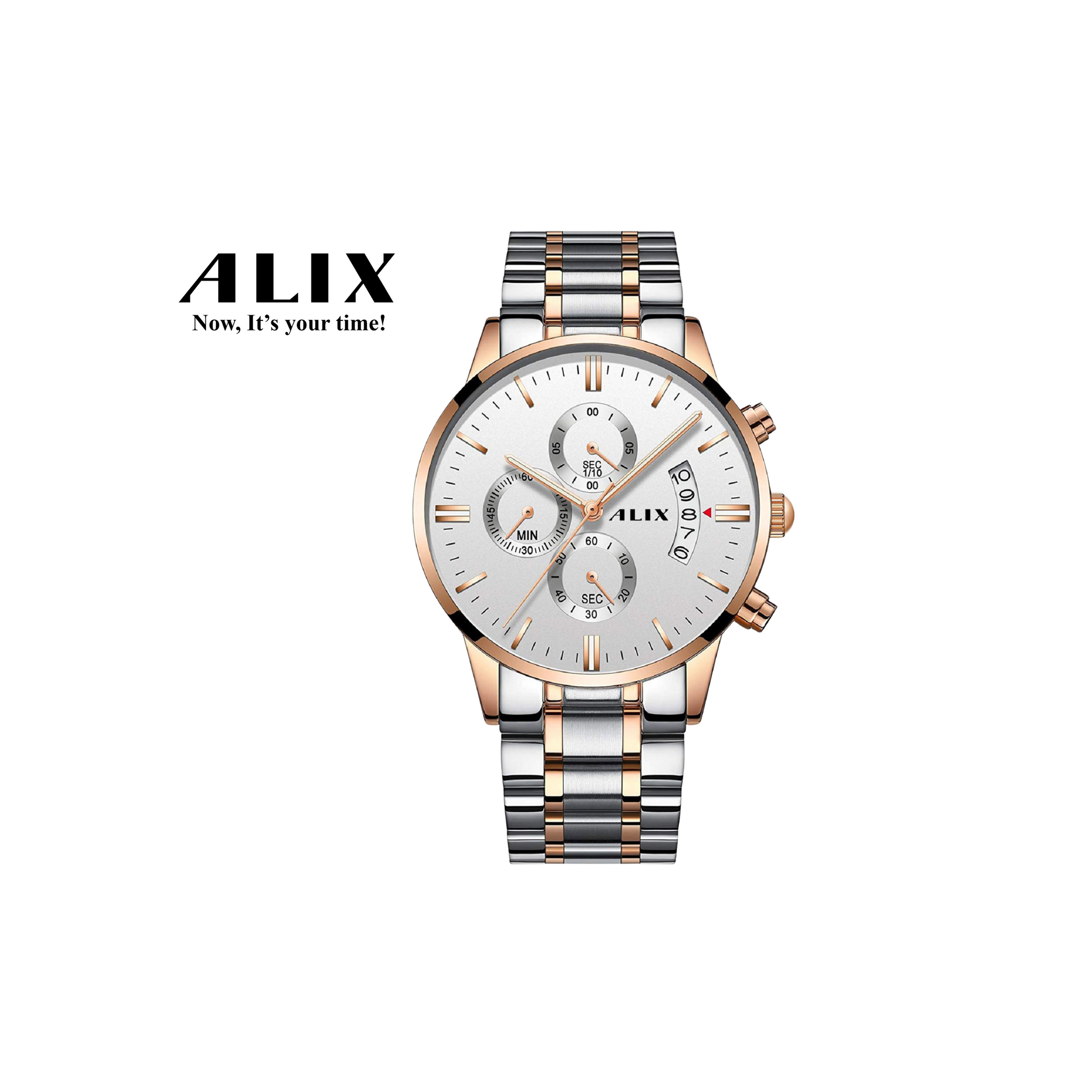 Alix 2309 Luxury Chronograph Analog Watch for Men – White & Rose Gold Dial with Silver-Rose Gold Strap