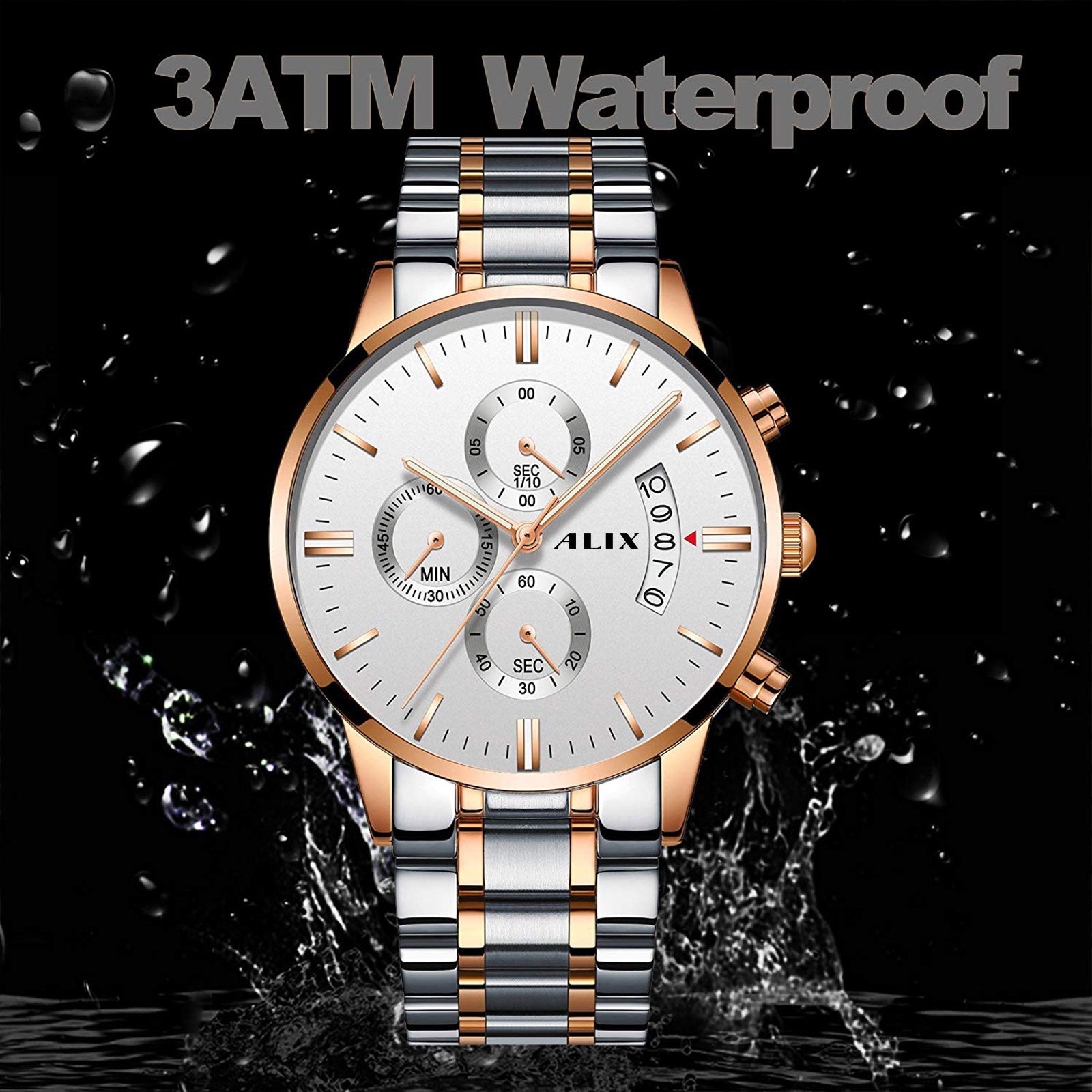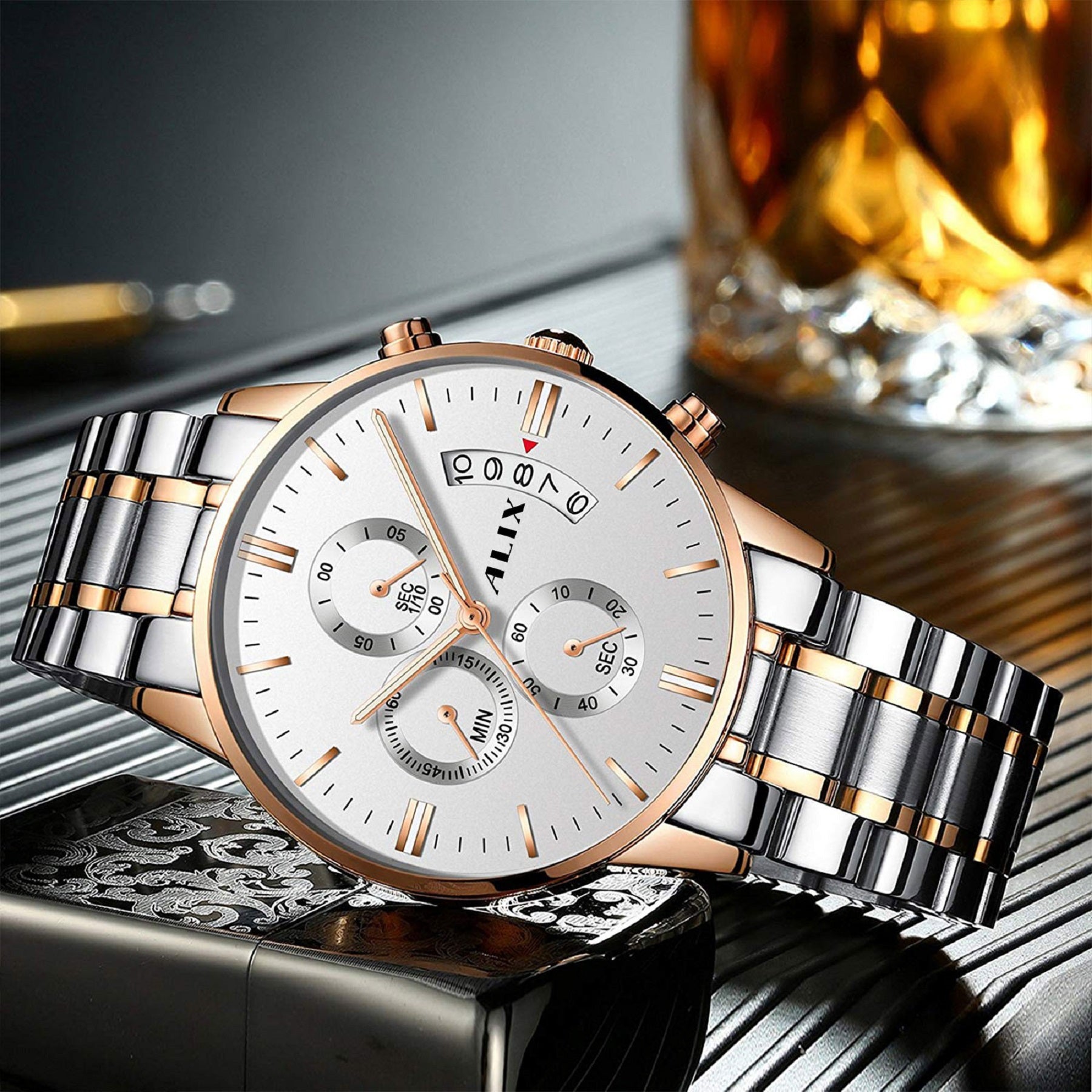 Elevate your style with the Alix 2309 Luxury Chronograph, a bold and elegant timepiece crafted for men who appreciate refined detailing and modern design. This analog watch features a striking White and rose gold round dial paired with a dual-tone silver and rose gold metal strap, making it ideal for weddings, parties, business meetings, or everyday wear.