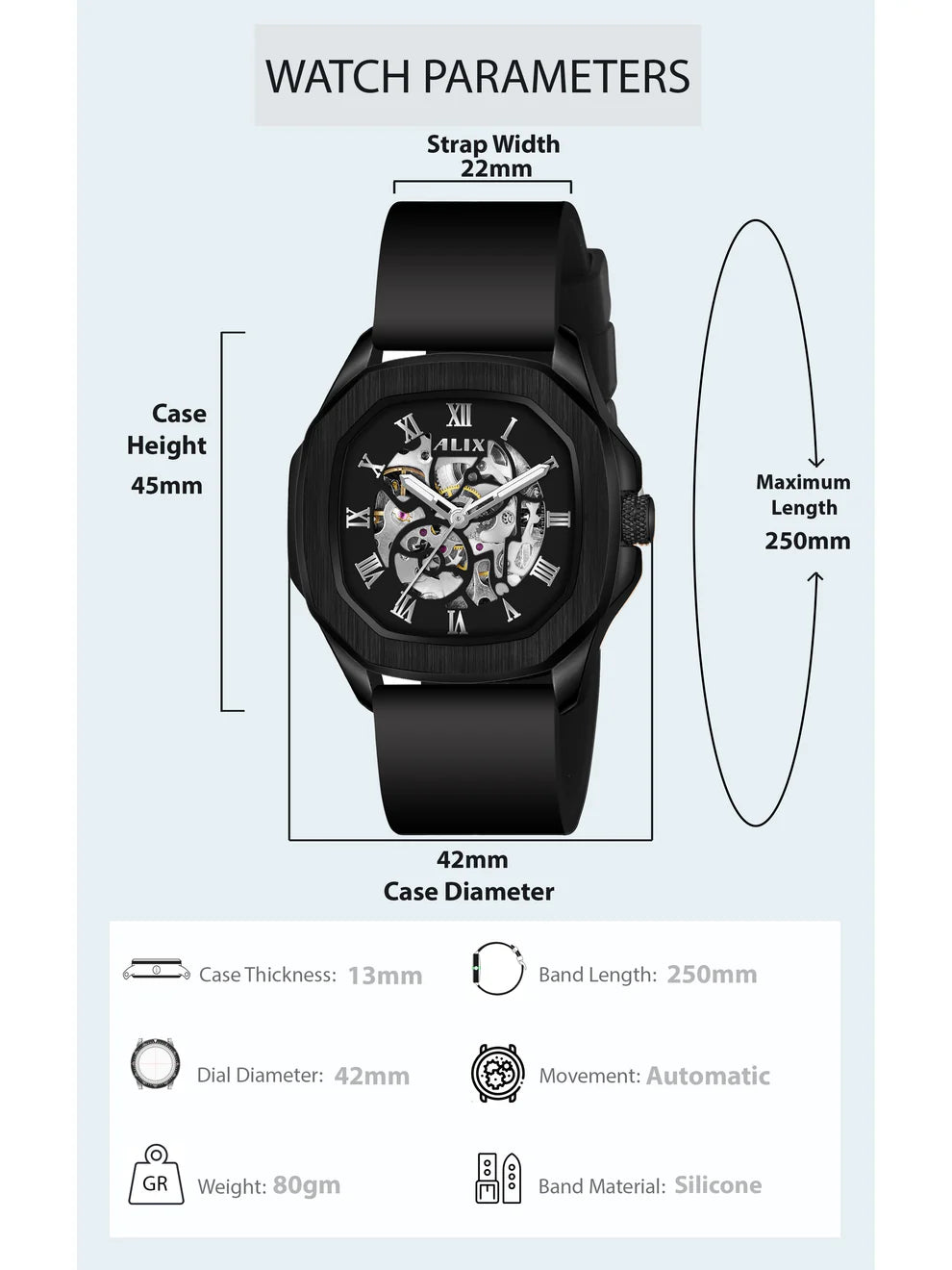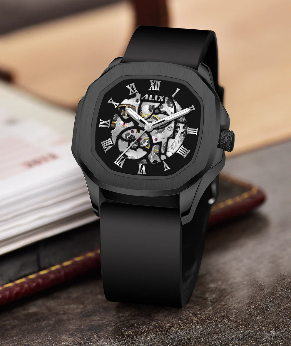 The ALIX AL2901 is a luxurious men's automatic watch featuring a striking skeleton dial, classic Roman numerals, and a soft silicone strap. Blending traditional craftsmanship with modern design, it offers timeless style and everyday functionality.