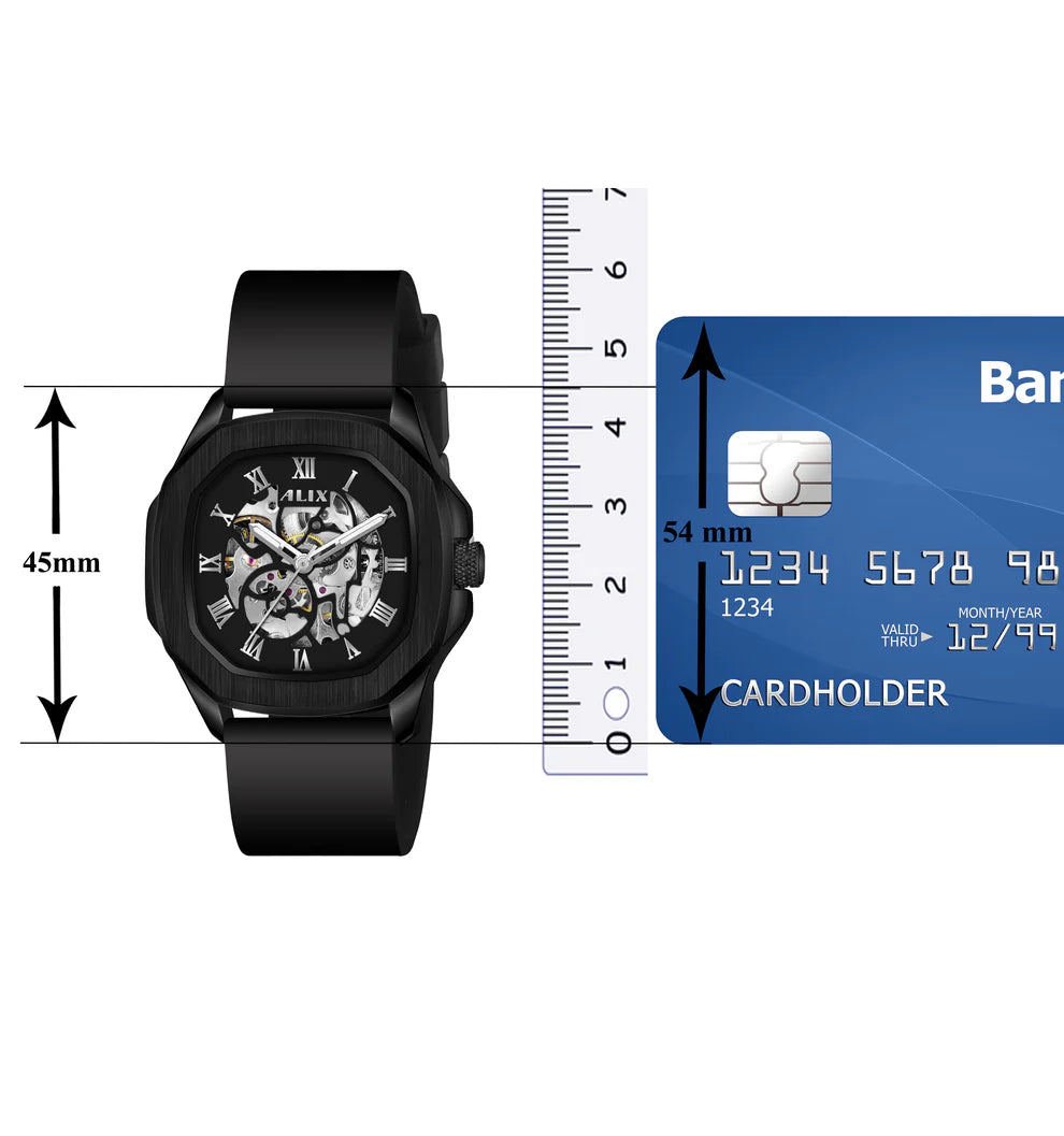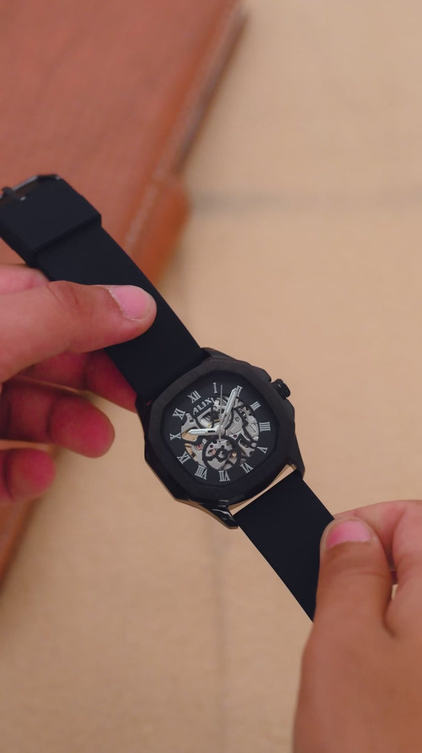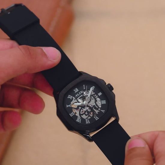 Men's Black Skeleton Automatic Watch | Silicone Strap | 3ATM Water Resistant