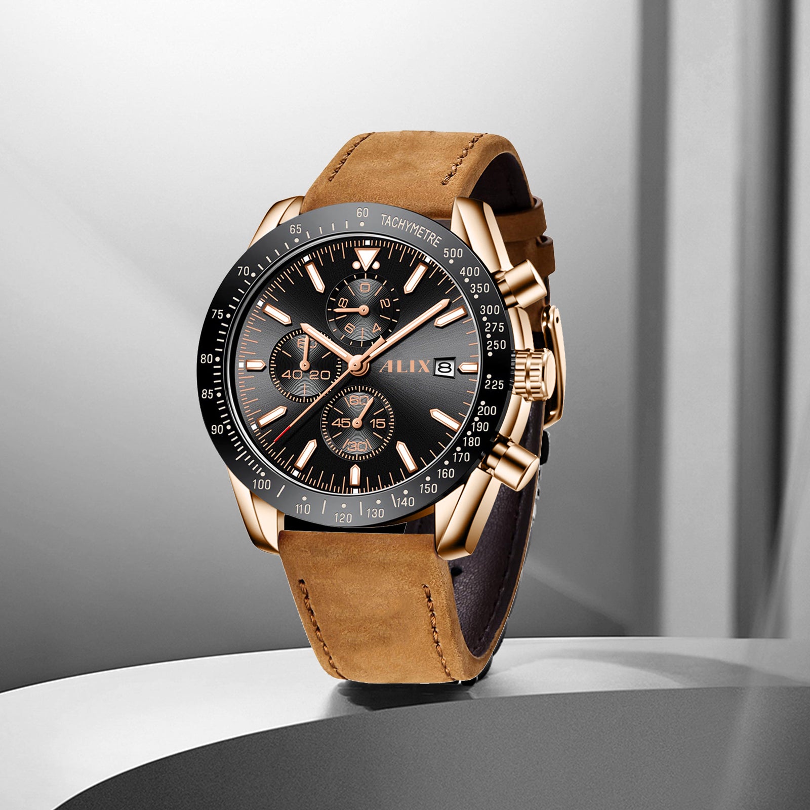 ALIX BlACK Dial Brown Leather Strap Chronograph Watch